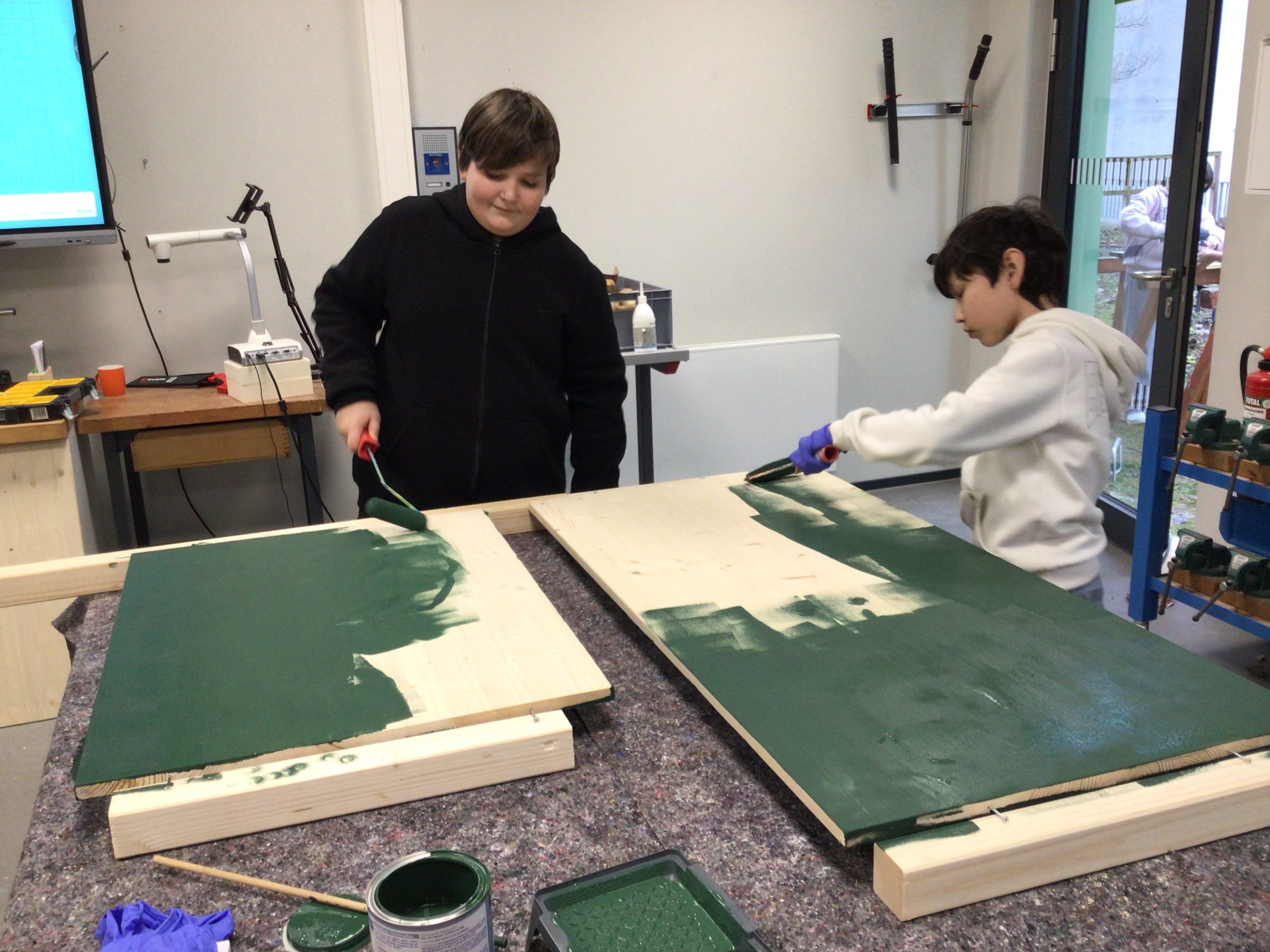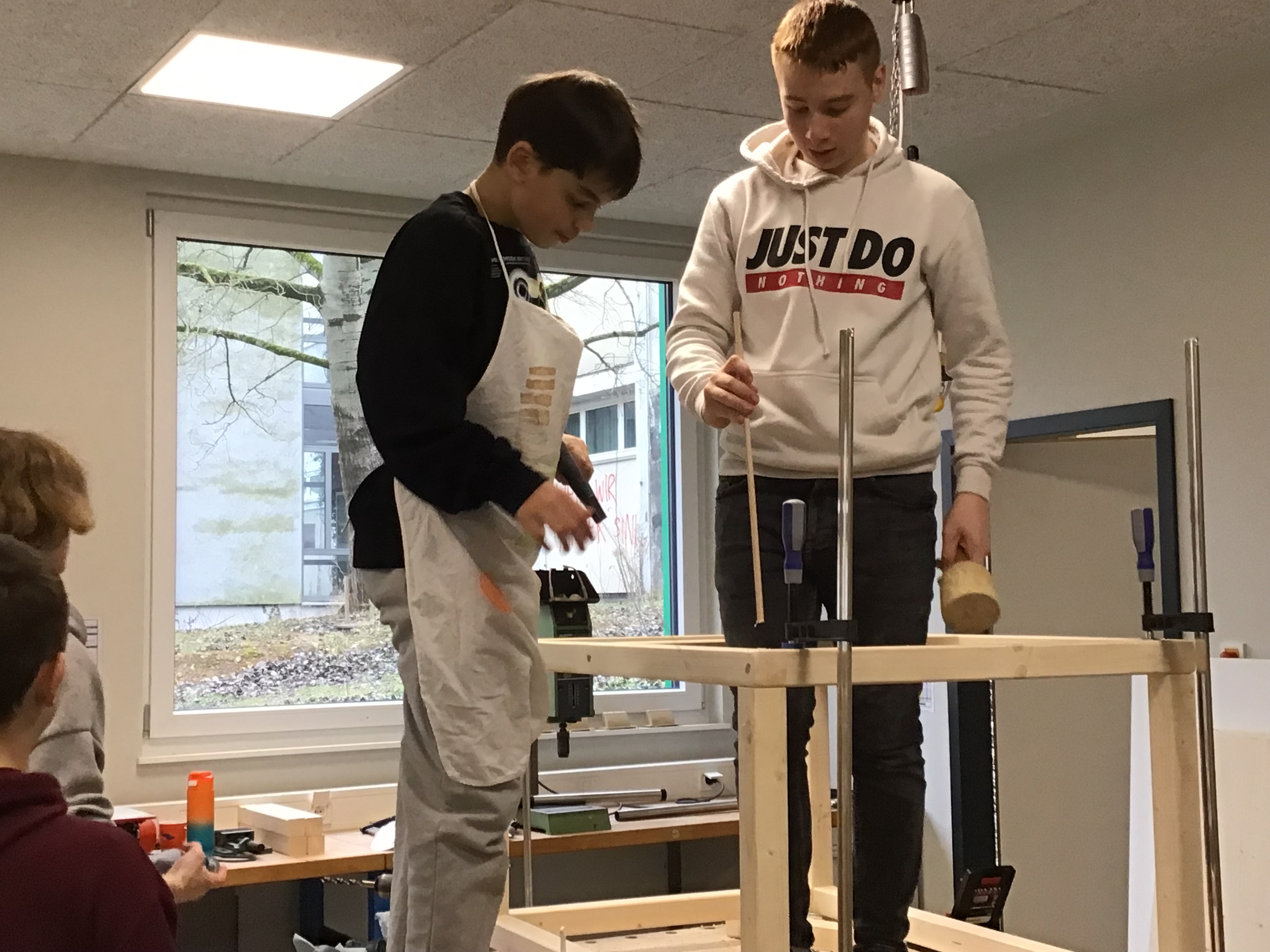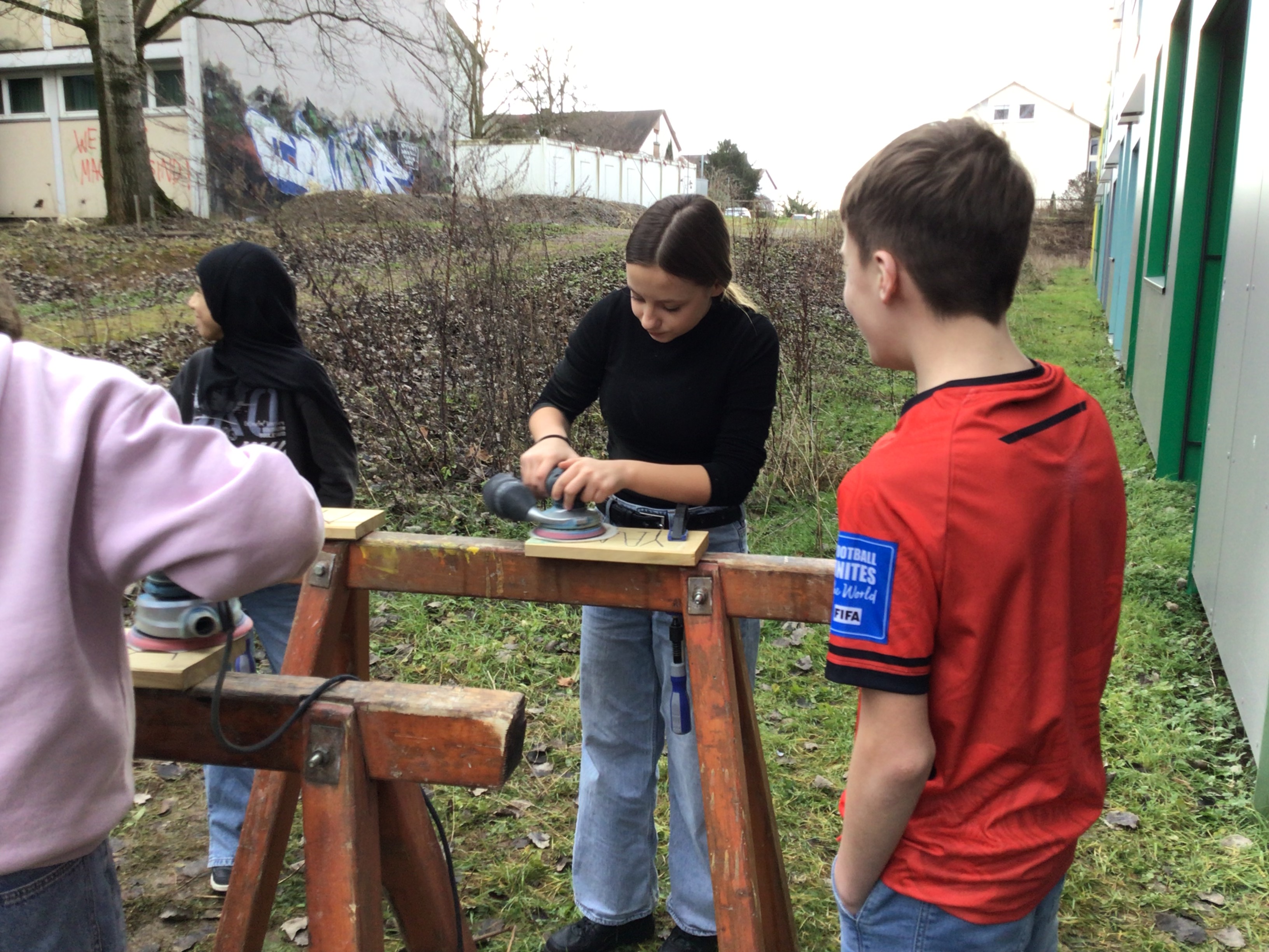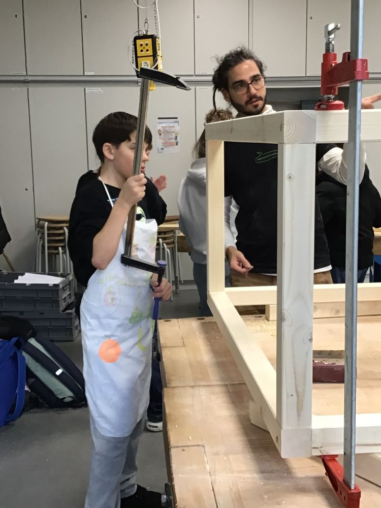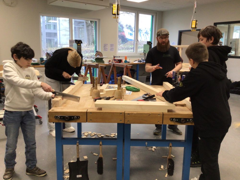 Die eigentliche Bauphase erstreckte sich über vier Tage im Januar. Dabei stand nicht Zuschauen, sondern aktives Mitmachen im Mittelpunkt. Unter Anleitung von zwei Schreinern arbeiteten die Schülerinnen und Schüler in Teams, ganz nach ihren individuellen Stärken und Talenten. Holz wurde zugeschnitten, geschliffen, bemalt und montiert, Schrauben gesetzt und Oberflächen gestaltet.