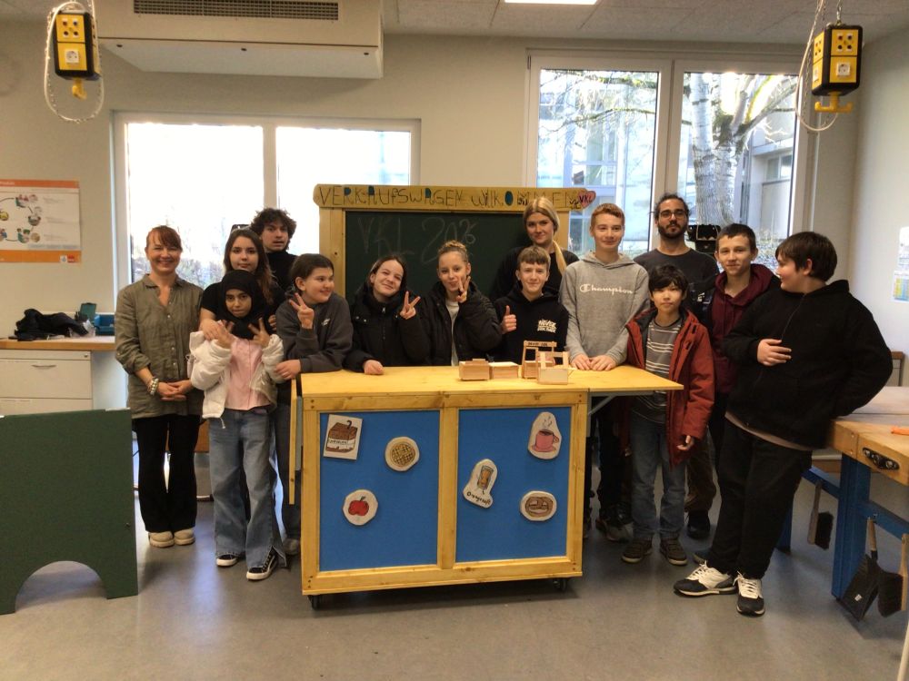 Bereits zu Beginn des Schuljahres machten sich 15 Schülerinnen und Schüler der Vorbereitungsgruppe gemeinsam mit ihrer Lehrerin, Angelika Fleck, und dem Projektleiter der Werkstattschule, Jakob Strack, an die Planung. Nach der gemeinsamen Ideenfindung stand schnell fest: Ein Verkaufsstand auf Rollen sollte gebaut werden, der bei Schulveranstaltungen und im Schulalltag vielseitig genutzt werden kann. Es folgten Skizzen, Modelle, Vermessungen und die Planung der einzelnen Arbeitsschritte.