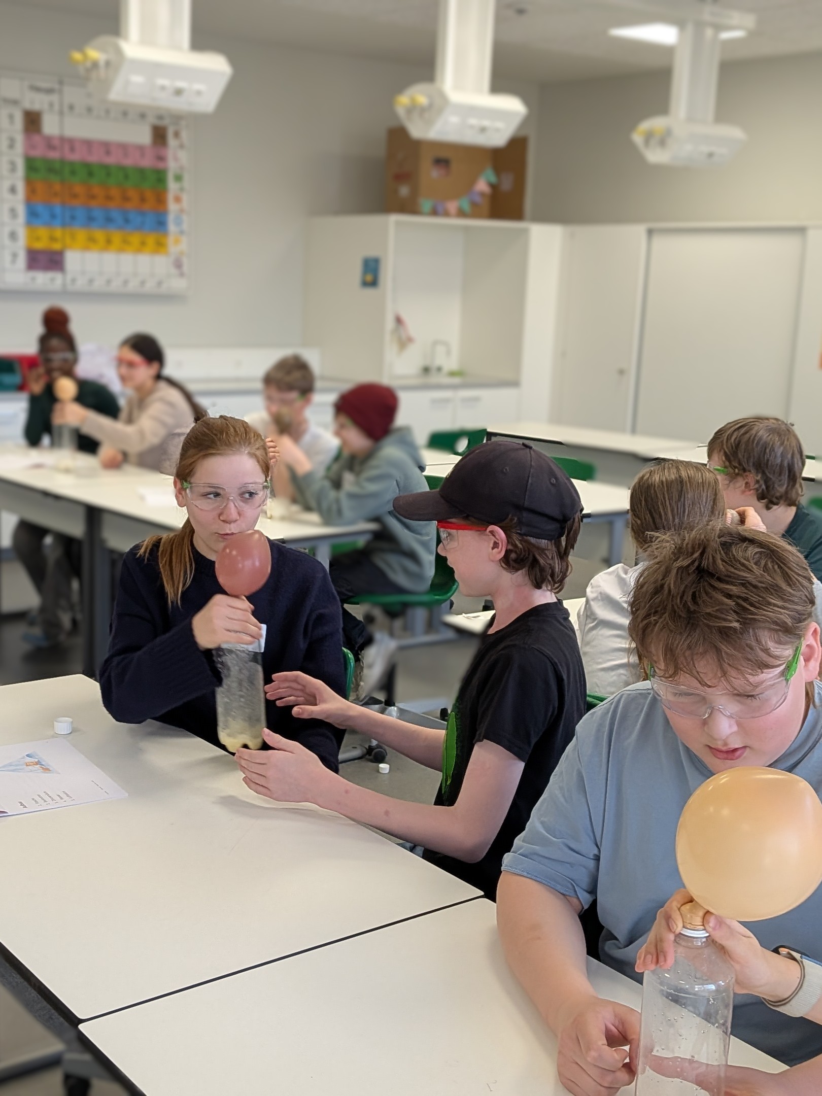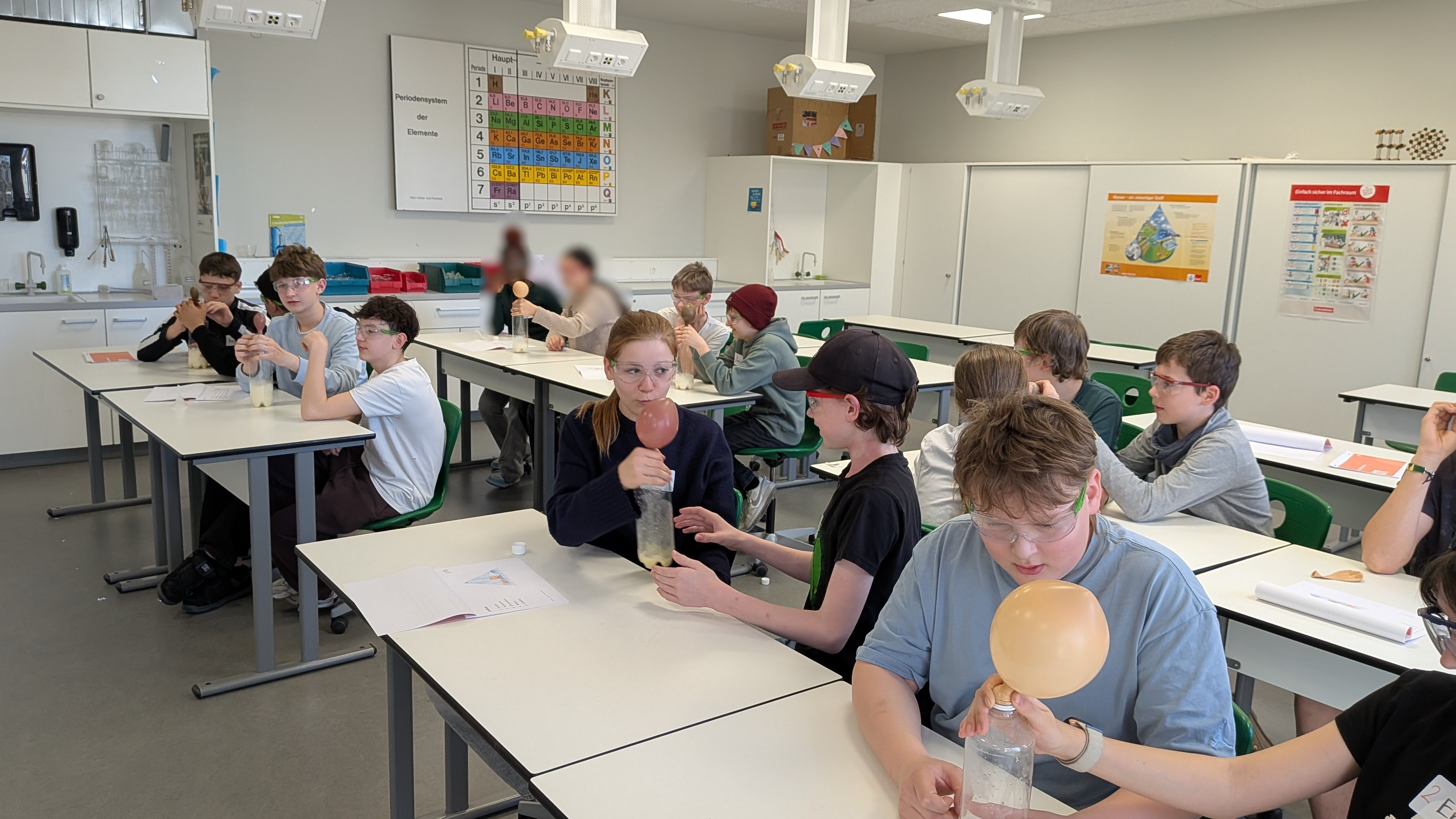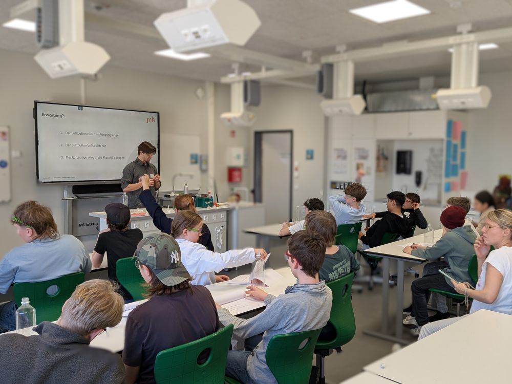 Im Mittelpunkt des Science Cafés im März stand das Thema CO₂ und Energie. Der Studierende Philipp Huber nahm die Gruppe mit auf eine Reise in die Welt der Chemie und des Klimawandels und hatte gleich zwei Experimente im Gepäck. Durch die Versuche konnten die Schüler:innen wichtige Eigenschaften von gasförmigem CO2 selbst erfahren. Ein Luftballon, mit Natron und Zitronensaft gefüllt, bläst sich von selbst auf. Mit einer Brausetablette kann man eine Kerze löschen, wenn man sie in Wasser auflöst und das Becherglas vorsichtig über ein brennendes Teelicht neigt. Erst in der Auswertungs- und Diskussionsrunde verriet der angehende Climate Change Manager Philipp Huber, daß er außerdem begeisterter Feuerwehrmann ist. Unterfüttert mit persönlichen Erfahrungen und beeindruckenden Feuerwehr-Videos kamen wichtige Zahlen und Fakten rund um CO₂, Energie und Klima richtig gut an. Das neu Gelernte wurde direkt in einem Quiz getestet – und die Schülerinnen und Schüler bewiesen, daß sie aufmerksam zugehört hatten.