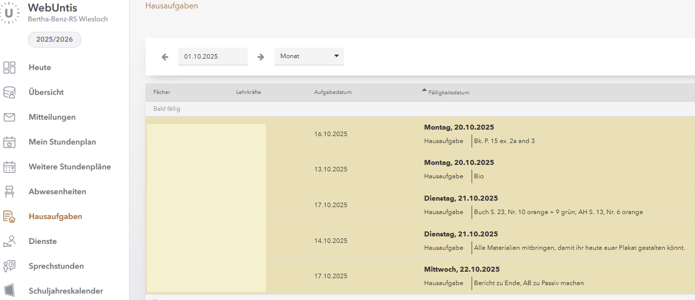 Im Anschluss gelangen Sie zur Übersicht in Untis. Dort haben Sie u.a. die Möglichkeit die aktuellen Hausaufgaben Ihres Kindes einzusehen, Sprechstunden am Elternsprechtag zu buchen uvm.