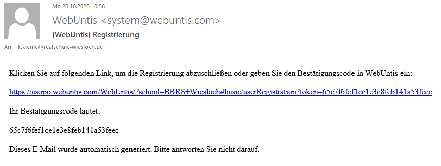 Klicken Sie auf den Link ODER kopieren Sie den Bestätigungscode in das Feld der Untis-Registrierung.