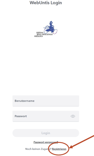 Rufen Sie die Anmeldeseite unter https://asopo.webuntis.com/WebUntis/?school=BBRS+Wiesloch#/basic/login auf und klicken Sie auf ‚Registrieren‘.